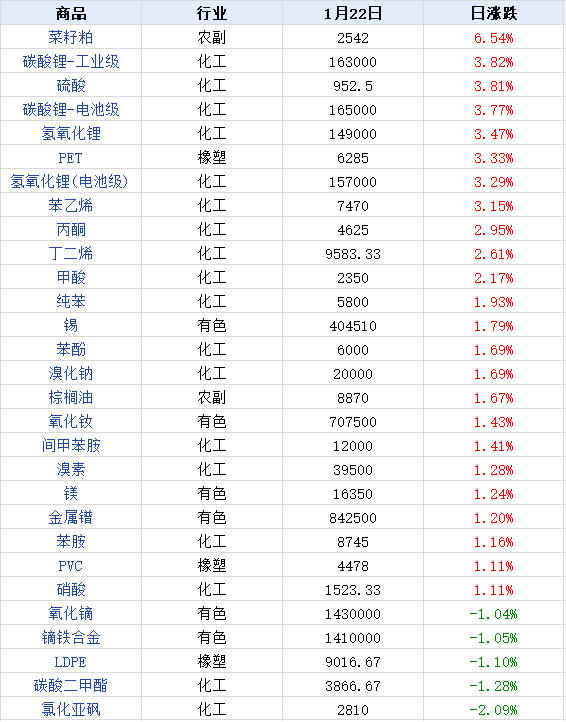 据生意社价格监测,2026年1月22日大宗商品价格涨跌榜中环比上升的商品共74种,集中在化工板块(共31种)和有色板块(共13种),涨幅在5%以上的商品主要集中在农副板块;涨幅前3的商品分别为菜籽粕(6.54%)、碳酸锂-工业级(3.82%)、硫酸(3.81%)。 环比下降的商品共33种,集中在化工(共12种)和能源(共5种),跌幅前3的商品分别为氯化亚砜(-2.09%)、碳酸二甲酯(-1.28%)、LDPE(-1.10%)。
